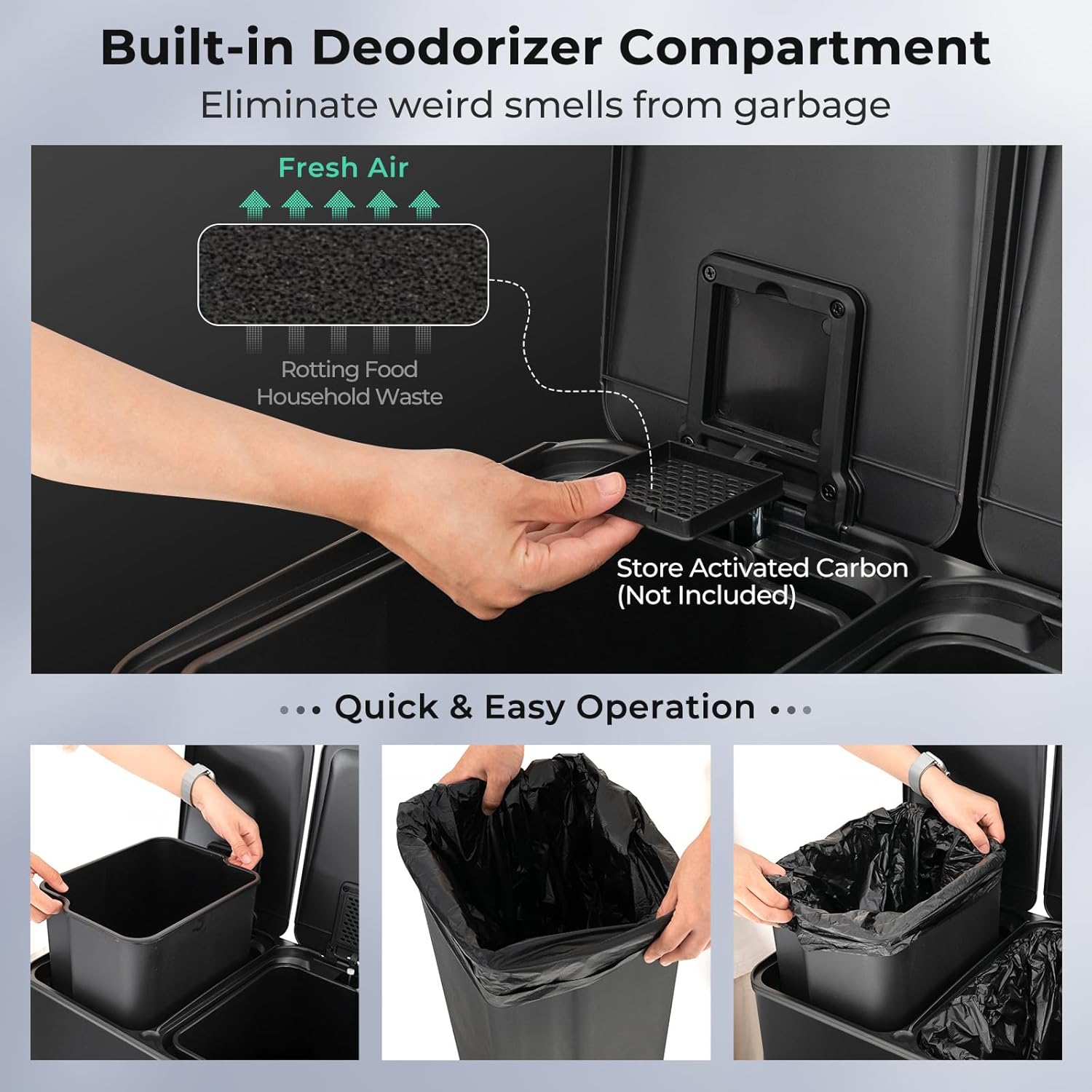 Plz find the reason why you can buy our Dual Rubbish Bin. The lids closes silently and well seal the smell in the rubbish bin. This 60L rubbish bin has two compartments for efficient waste separation. Just separately step on the pedal to open any of the lid of the double recycling bins. Feature: The PP buckets are firm and light Carry handles for easy transportation Anti-skid bottom for enhanced stability Combination of functionality and aesthetics Finger proof stainless steel for durability and nice looking Specification: Color: Silver/ Black/ White Net Weight: 7.5 kg Material: Stainless Steel, PP Height of Opened State: 98 cm Capacity of Each Compartment: 30 L Overall Size: 48 x 38 x 67 cm (L x W x H) Size of Each Barrel: 28 x 22 x 65 cm (L x W x H) Size of Each Deodorizer Compartment: 7 x 7 cm (L x W) Package Includes: 1 x Trash Can