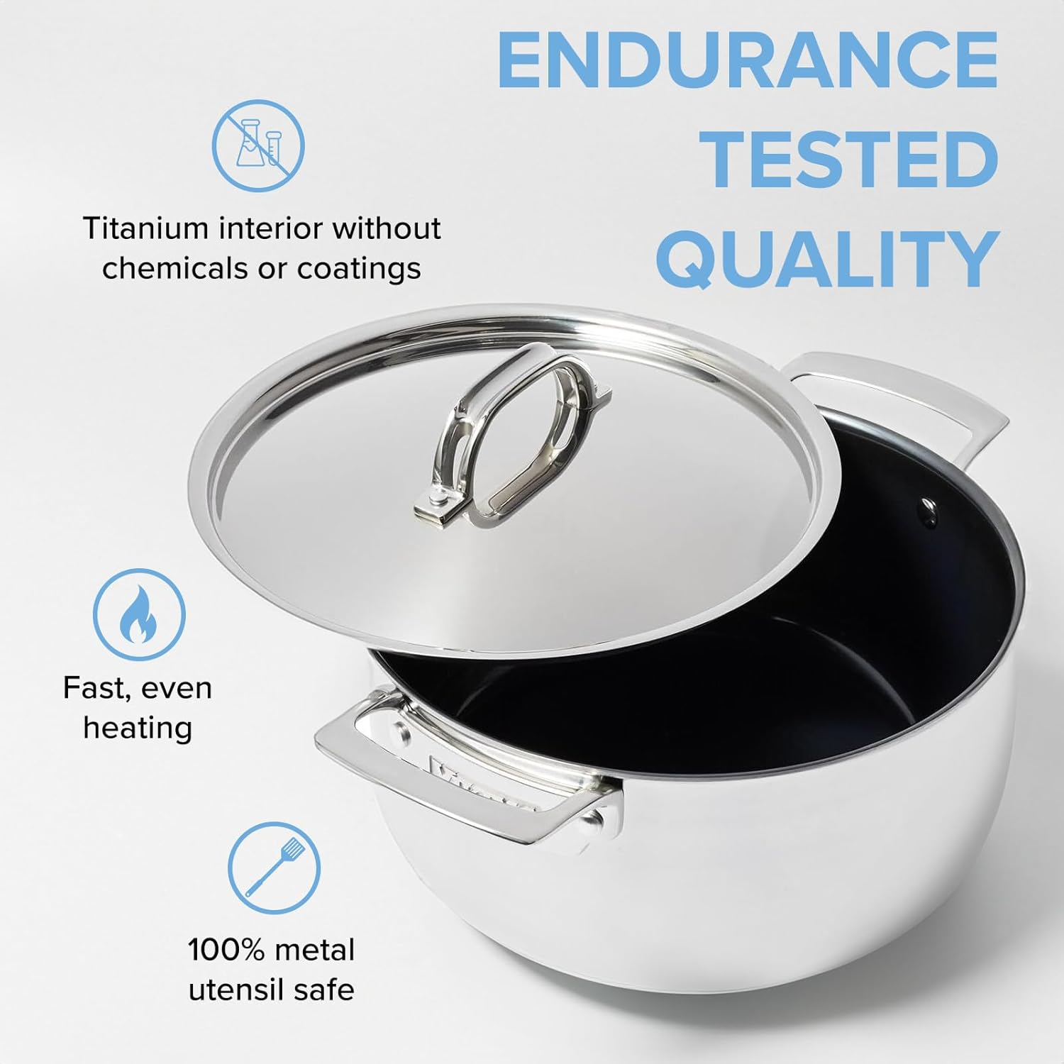 Create culinary masterpieces and elevate your kitchen with the Viking 5 Qt Laser Clad Titanium Dutch Oven! Great for both beginner and veteran chefs, this cooktop dutch oven is perfect for braising meat, boiling pasta, and for preparing large batches of soups, broths, sauces, and much more. Our big dutch oven can be preseasoned for a nonstick-like performance, and and won't react with acidic or alkaline foods. This dutch oven pot features a durable 4 ply construction consisting of a induction capable stainless steel interior, aluminum core, and a laser clad titanium exterior, and the sleek blue and silver finish provides an excellent complement to contemporary kitchen decors. Our dutch oven pans with lids feature riveted ergonomic handles which allow for comfort, balance and control as you move your pan around the kitchen, and the handles feature a heat break to keep them cool during use. Our dutch oven pots are easy to hand wash with hot water, are compatible with all cooking surfaces including gas, electric, and induction, and are safe up to 600 degrees F (315 degrees C). Our dutch ovens are backed by a limited lifetime warranty.