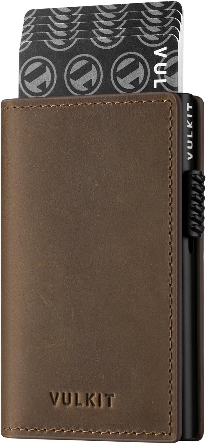 VULKIT Minimalist Card Holder Wallet Top Grain Leather Pop Up Cards RFID Protection Holds Up to 10 Cards, Magnetic Closure